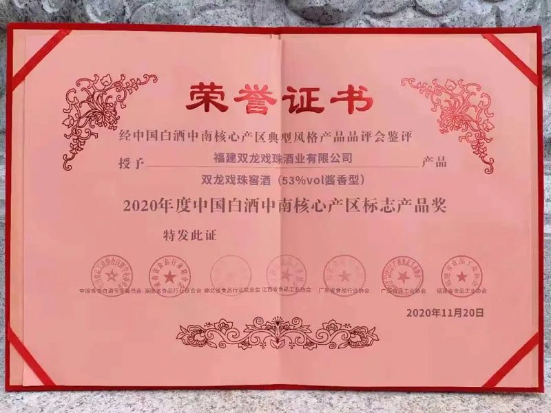在20日舉行的中南核心產(chǎn)區(qū)典型風格產(chǎn)品品評會上,經(jīng)30位白酒專家對中南六省80余款代表性產(chǎn)品進行現(xiàn)場暗評。雙龍戲珠酒業(yè)選送的雙龍戲珠窖酒(53%vol醬香型)榮獲“2020年度中國白酒中南核心產(chǎn)區(qū)標志產(chǎn)品獎”。