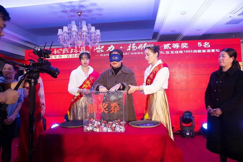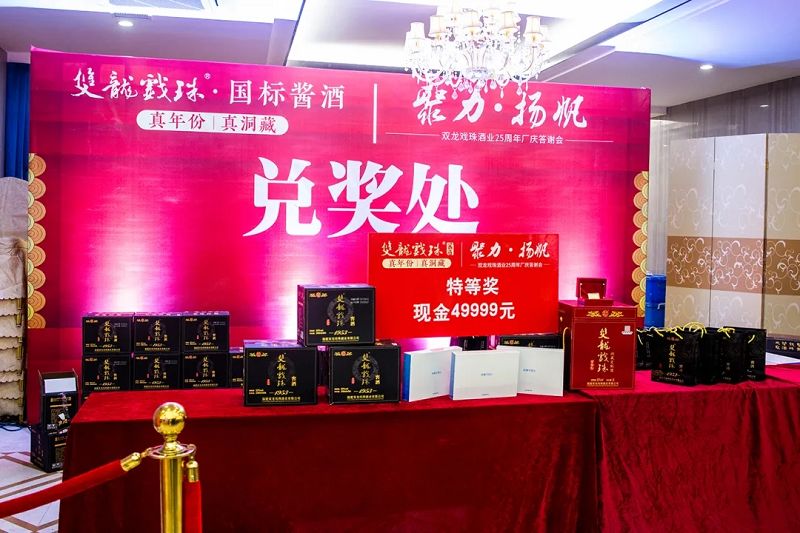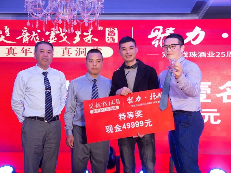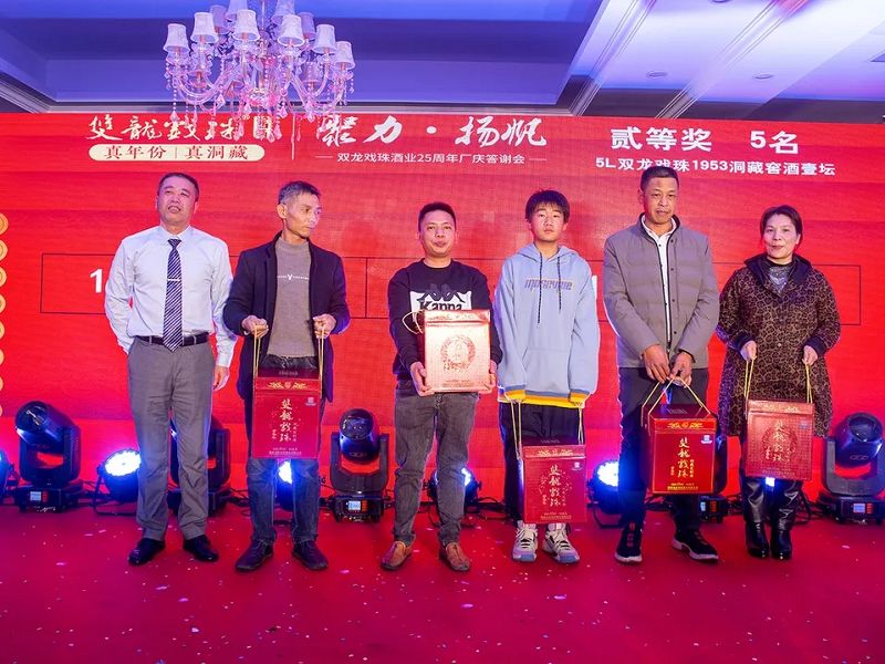 精彩的活動(dòng)少不了重磅的大獎(jiǎng),本次雙龍戲珠酒業(yè)25周年廠慶答謝宴(政和站)設(shè)置了特等獎(jiǎng)(49999元現(xiàn)金大獎(jiǎng))、一等獎(jiǎng)(10克雙龍戲珠金條)、二等獎(jiǎng)(5L雙龍戲珠1953洞藏窖酒)、三等獎(jiǎng)(華為平板壹臺(tái))、四等獎(jiǎng)(雙龍戲珠1953窖酒248ml壹箱)、幸運(yùn)獎(jiǎng)(雙龍戲珠1953窖酒248ml貳瓶)。