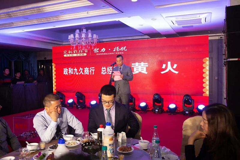 九久貿(mào)易商行總經(jīng)理黃火代表各位合作商和廣大消費(fèi)者對(duì)雙龍戲珠酒業(yè)25周年廠慶表示祝賀。