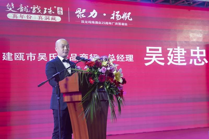 12月12日,雙龍戲珠酒業(yè)25周年廠慶答謝宴建甌站第二場暨雙龍戲珠首屆民間最牛品酒師建甌賽區(qū)半決賽在建甌市福興福大酒店隆重舉行。雙龍戲珠酒業(yè)總經(jīng)理黃盛堯、建甌市吳氏兄弟食品商行總經(jīng)理吳建忠出席活動并致辭。