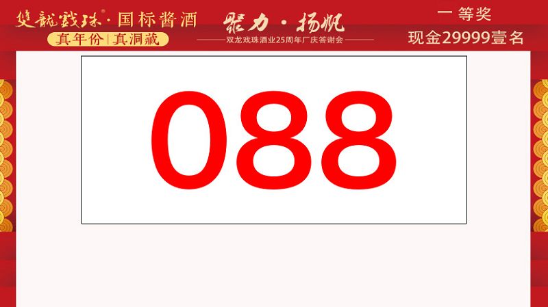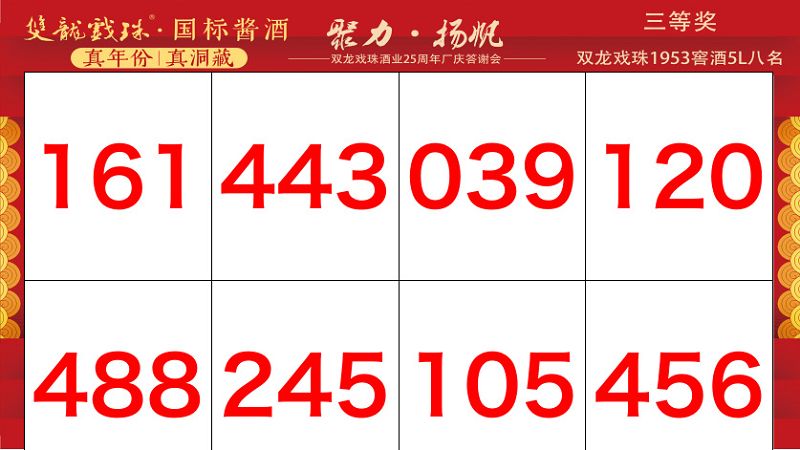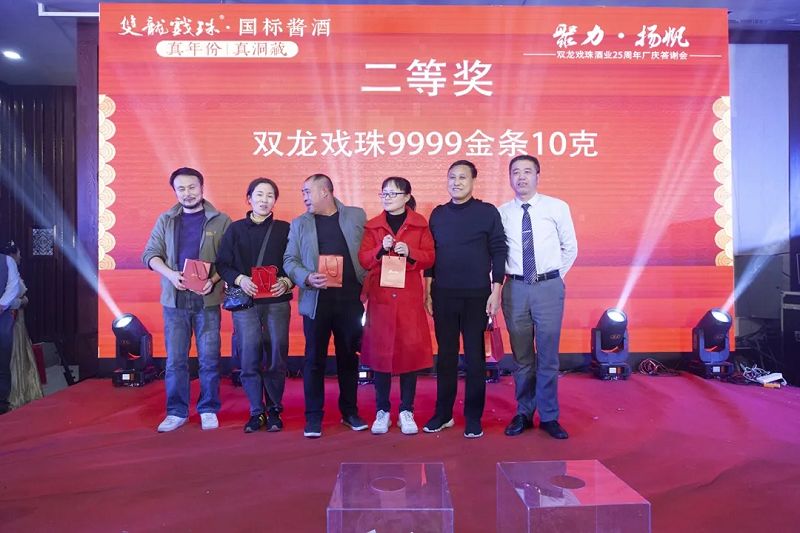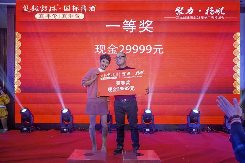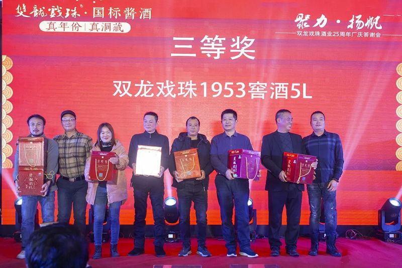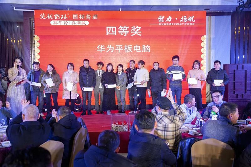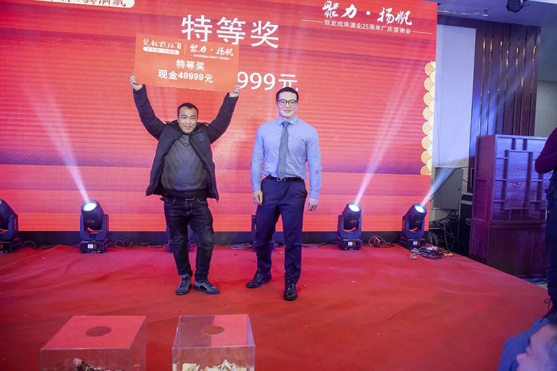 本場答謝宴共誕生特等獎(49999元現(xiàn)金)得主1位、一等獎(29999元現(xiàn)金)得主1位、二等獎(雙龍戲珠9999金條10克)得主5位、三等獎(5L雙龍戲珠1953洞藏窖酒)得主8位、四等獎(華為平板電腦壹臺)得主30位、五等獎(雙龍戲珠1953窖酒248ml壹箱)得主53名。