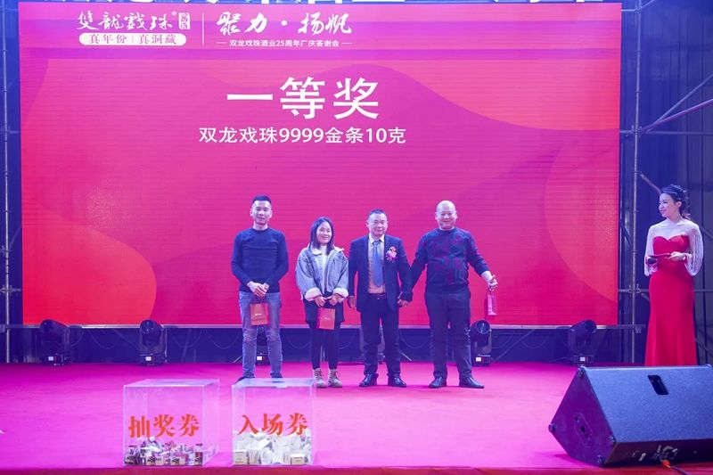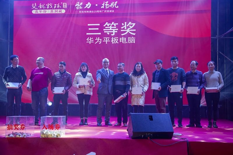 本場答謝宴共誕生特等獎(49999元現(xiàn)金)得主1位、一等獎(雙龍戲珠9999金條10克)得主3位、二等獎(5L雙龍戲珠1953洞藏窖酒)得主5位、三等獎(華為平板電腦壹臺)得主20位、四等獎(雙龍戲珠1953窖酒248ml壹箱)得主30名。