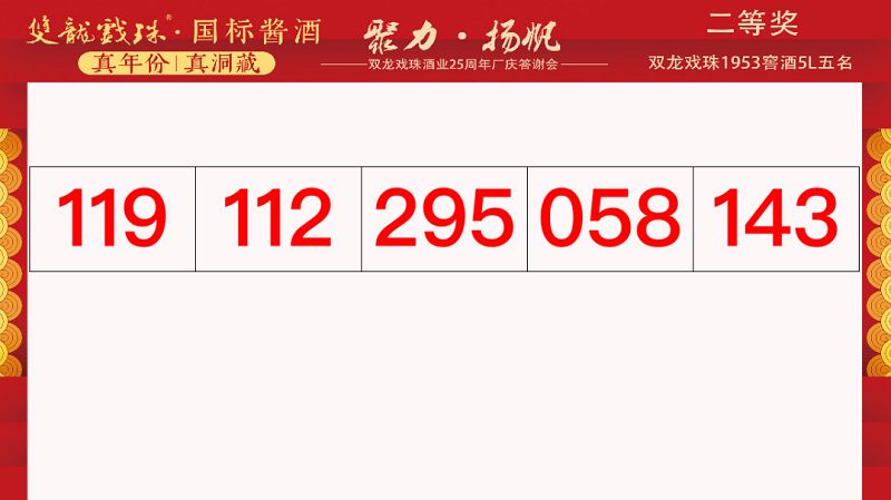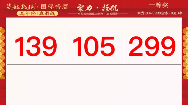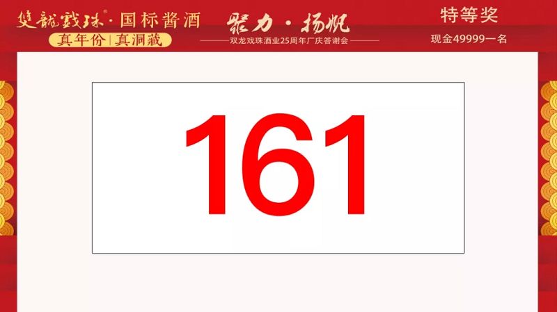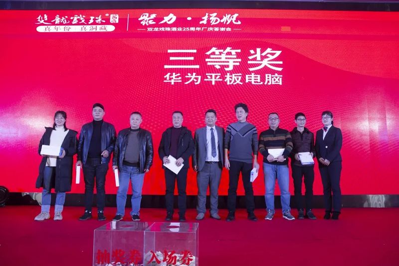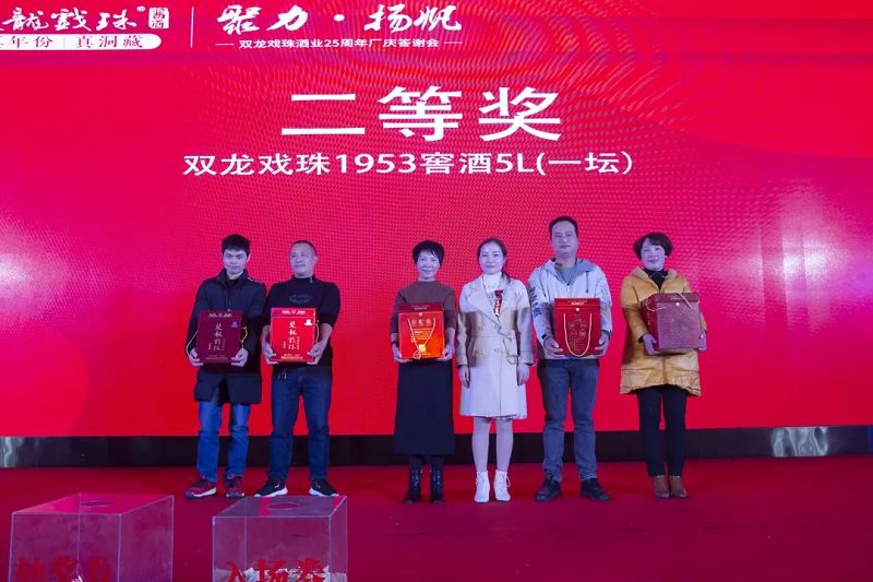 本場答謝宴共誕生特等獎(jiǎng)(49999元現(xiàn)金)得主1位、一等獎(jiǎng)(雙龍戲珠9999金條10克)得主3位、二等獎(jiǎng)(5L雙龍戲珠1953洞藏窖酒)得主5位、三等獎(jiǎng)(華為平板電腦壹臺(tái))得主20位、四等獎(jiǎng)(雙龍戲珠1953窖酒248ml壹箱)得主30名。
