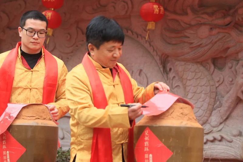 二月二,龍?zhí)ь^,是陽氣回升,大地春回的日子,也是雙龍戲珠新一年釀酒季的開始。每年立春后釀出的最早一批酒,稱為春釀,經(jīng)過一個冬天的低溫發(fā)酵,春釀有著更佳的品質。祭祀儀式后,雙龍戲珠酒業(yè)董事長黃德鋒、總經(jīng)理黃盛堯等公司高管在雙龍壁前舉行封壇,將春釀封存洞藏,表達了對新一年的美好祝愿。