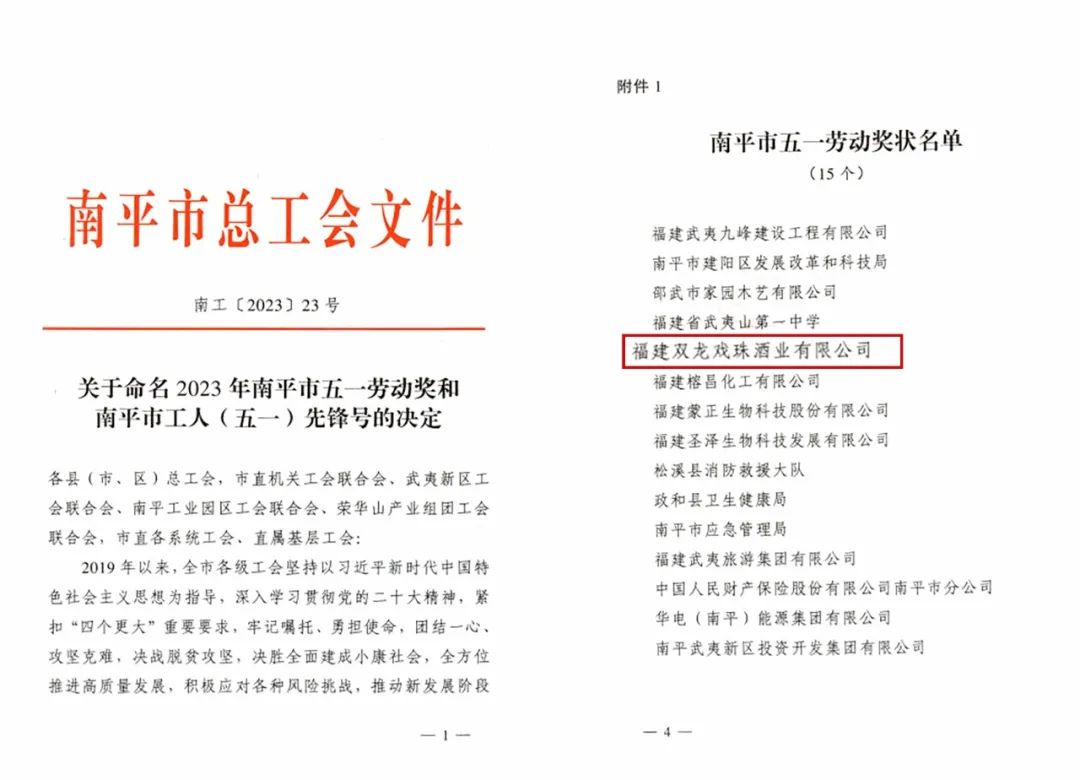 近日,從南平市總工會(huì)傳來(lái)喜報(bào),福建雙龍戲珠酒業(yè)有限公司榮獲2023年南平市“五一勞動(dòng)獎(jiǎng)”榮譽(yù)稱號(hào),這是南平市總工會(huì)對(duì)雙龍戲珠酒業(yè)工作的充分肯定和鼓勵(lì)。