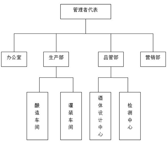 本公司確立以管理者代表負責的質(zhì)量管理組織,由品管部全面負責公司的產(chǎn)品質(zhì)量。下設辦公室、生產(chǎn)部(負責釀造車間和灌裝車間)、品管部(負責檢測中心和酒體設計中心)、營銷部。