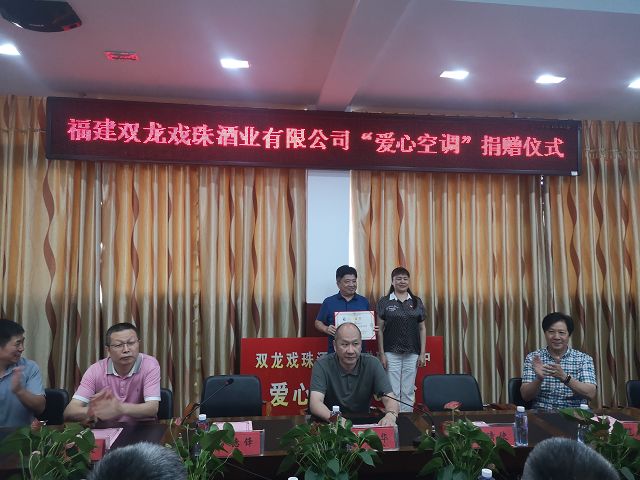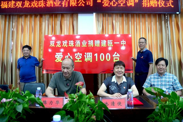 2020年6月12日,福建雙龍戲珠酒業(yè)有限公司向建甌一中捐贈(zèng)100臺(tái)空調(diào),用于舊校區(qū)教室改造升級,讓莘莘學(xué)子在清涼一夏的舒適環(huán)境中好好學(xué)習(xí)。愛心捐贈(zèng)活動(dòng)在建甌一中小會(huì)議室隆重舉行。建甌市委常委宣傳部部長陳力華、建甌市副市長池清使、建甌市教育局領(lǐng)導(dǎo)、福建雙龍戲珠酒業(yè)有限公司董事長黃德鋒、建甌一中黨委委員、年段長和學(xué)生代表參加了儀式。