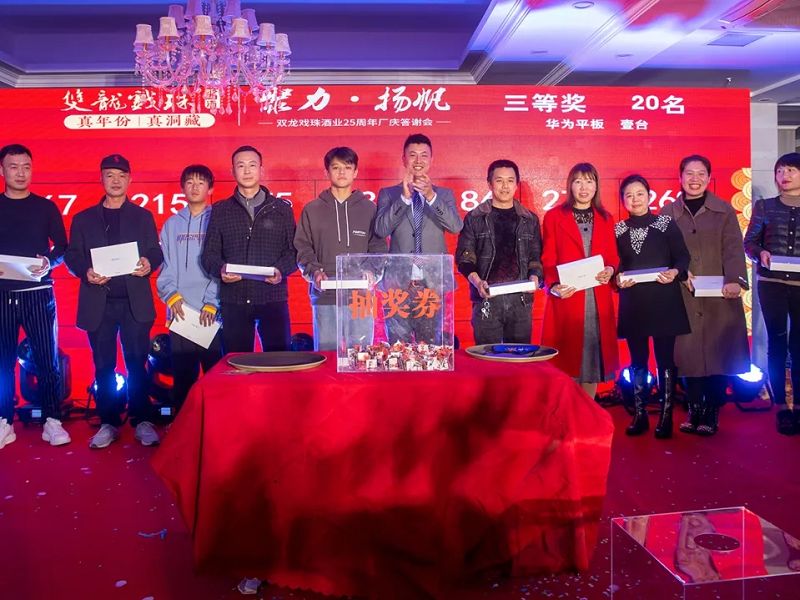 精彩的活動(dòng)少不了重磅的大獎(jiǎng),本次雙龍戲珠酒業(yè)25周年廠慶答謝宴(政和站)設(shè)置了特等獎(jiǎng)(49999元現(xiàn)金大獎(jiǎng))、一等獎(jiǎng)(10克雙龍戲珠金條)、二等獎(jiǎng)(5L雙龍戲珠1953洞藏窖酒)、三等獎(jiǎng)(華為平板壹臺(tái))、四等獎(jiǎng)(雙龍戲珠1953窖酒248ml壹箱)、幸運(yùn)獎(jiǎng)(雙龍戲珠1953窖酒248ml貳瓶)。