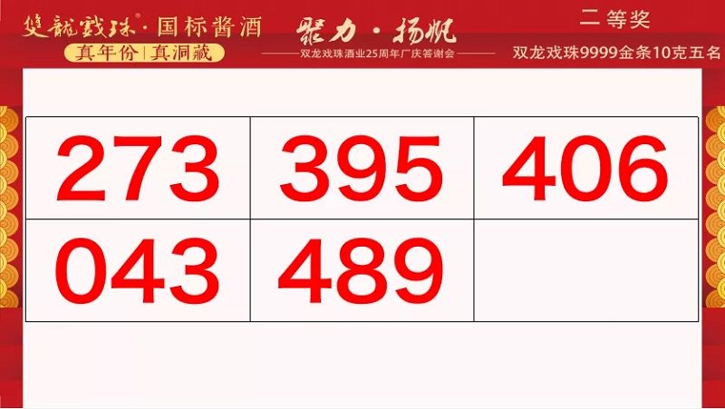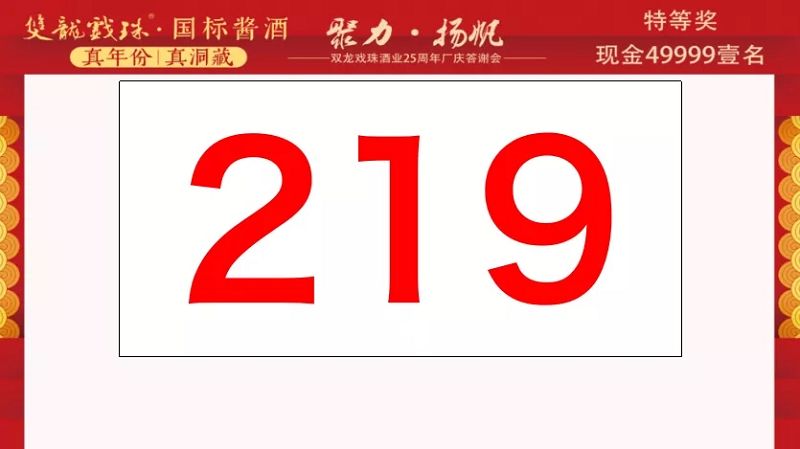本場答謝宴共誕生特等獎(49999元現(xiàn)金)得主1位、一等獎(29999元現(xiàn)金)得主1位、二等獎(雙龍戲珠9999金條10克)得主5位、三等獎(5L雙龍戲珠1953洞藏窖酒)得主8位、四等獎(華為平板電腦壹臺)得主30位、五等獎(雙龍戲珠1953窖酒248ml壹箱)得主53名。