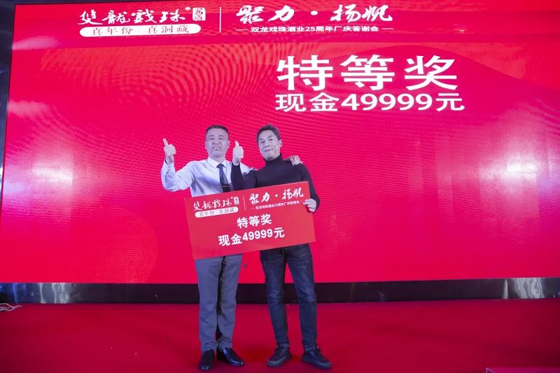 本場答謝宴共誕生特等獎(jiǎng)(49999元現(xiàn)金)得主1位、一等獎(jiǎng)(雙龍戲珠9999金條10克)得主3位、二等獎(jiǎng)(5L雙龍戲珠1953洞藏窖酒)得主5位、三等獎(jiǎng)(華為平板電腦壹臺(tái))得主20位、四等獎(jiǎng)(雙龍戲珠1953窖酒248ml壹箱)得主30名。